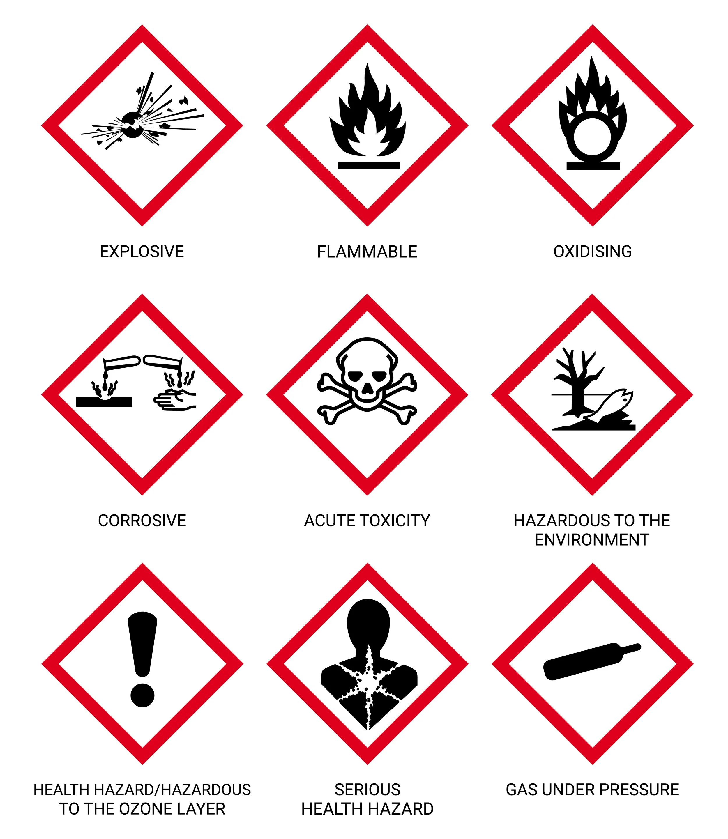Types of hazards: Physical (flammable, reactive), Health (toxic, corrosive)